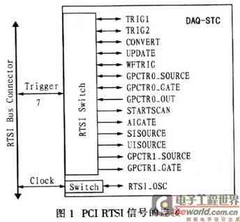 对于PCI总线E系列数据采集卡,有15种信号与RTSI总线相连,包括时基信号、数据采集时钟、D/A输出时钟、板上通用计数器信号、外部PFI(可编程输入)信号等,如图1所示。