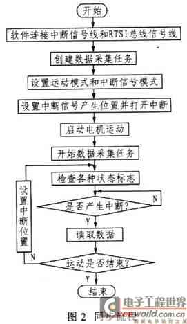 当运动控制卡控制电机运动到某个位置时,编码器上返回的位置信号一旦符合设定的位置条件,将发出1个中断信号。该信号可作为数据采集卡采集信号的触发条件,使采集卡能实时采集所需数据。运动控制卡和数据采集卡可以通过RTSI总线实现二者之间的同步。运动控制卡产生的中断信号通过内部电路传送到RTSI输出引脚,目前RTSI输出引脚主要有7个(RTSIO-RTSl6)。RPSI输出引脚可通过外部电缆与数据采集卡的RTSI引脚相连。采集卡的RTSI引脚也可以通过内部电路与其控制信号(见图1)相连,从而实现二者之间的同步。
