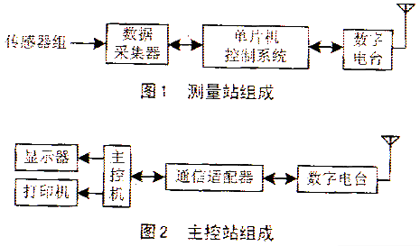系统由测量站和主控站两部分组成。测量站主要完成对现场信号的采集、存储,接收遥控指令并发送数据。主控站的主要工作是发送遥控指令、接收数据信息、进行数据处理和数据管理、随机显示打印等。