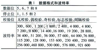 通过编程设置UART,支持各种数据格式和波特率。在PC机的COM端口编程设置UART的数据格式和波特率。表1为其数据格式和波特率。