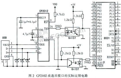 采用CP2102改造的接口应用电路如图2所示。该电路已通过制板和软硬件调试,完全可靠。串口扩展,仪需2~3只外部去耦电容器,REGIN端需加0.1μF与1.0μF并联的去耦电容。CP2102的供电电源由计算机的USB接口提供,再连接3只保护管以便于使用。该电路仅使用CP2102的UART总线上TXD/RXD 2个引脚,其余悬空。单片机可直接识别CP2102的UART总线上信号,为确保数据收发的稳定性,避免通信过程产生干扰,采用光电耦合器隔离,并将RST采用一只4.7 kΩ电阻上拉至VDD。