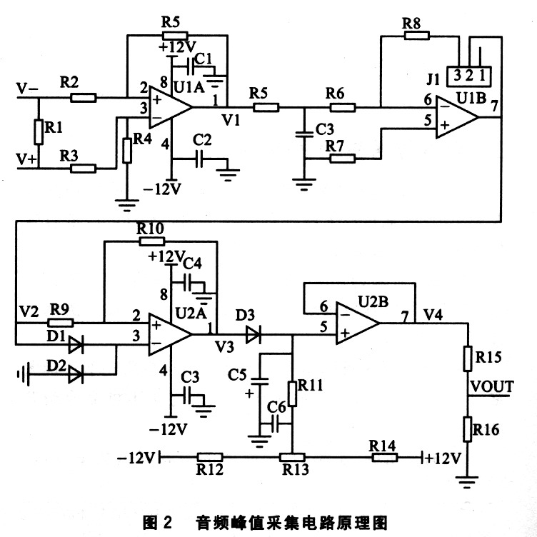 音频峰值采集电路的输入部分为减法电路,如图2所示。输入信号可以为平衡音频信号: