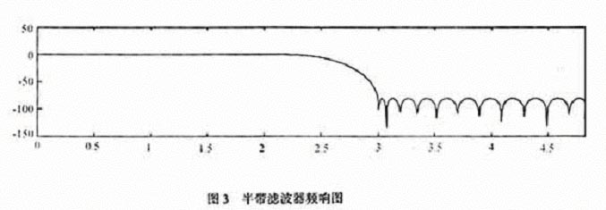 半带滤波器是一种特殊的线性相位滤波器,它将近有一半的系数精确为零,因此其实现滤波的运算量与同样长度的其它线性相位滤波器相比减少将近一半。根据半带滤波器的频率特性和运算量少的优点,可用它来作为变换因子为2的抽取或插值滤波器。