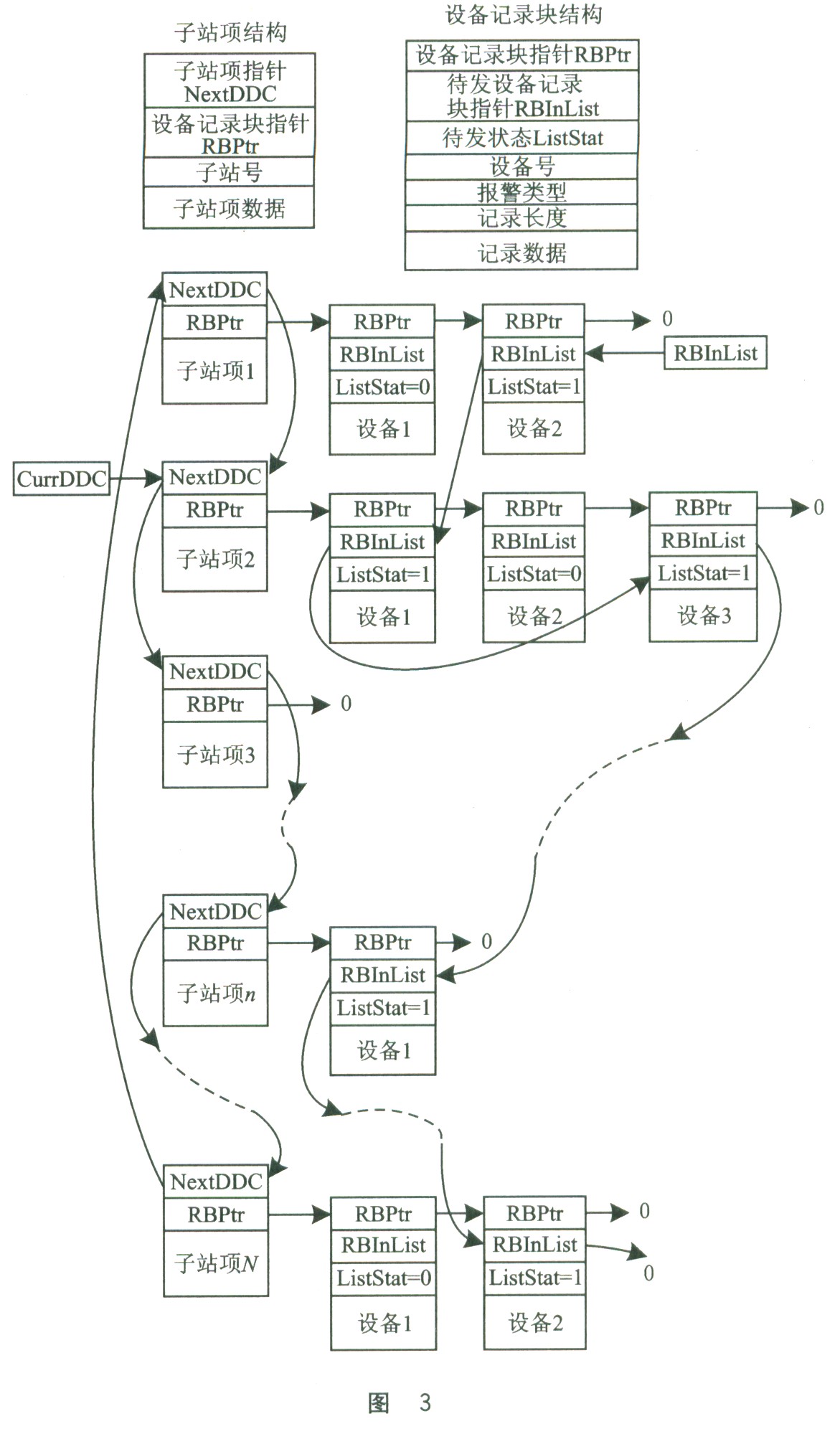 采集器中,为设备控制数据块设置从网口到串口的队列。设备状态数据块须定期地从各子站中读取并刷新存储,变化的状态须向管理机发送。为此,设置子站项和设备记录块两种基本结构,构成三种链表,如图3所示。
