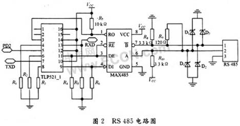 在该设计中,首先采用光电隔离。图2中,四位一体的光电耦合器TLP521_1使单片机与MAX485之间实现了完全的电隔离,消除了相互干扰,提高了工作的可靠性。如图2所示,单片机接收端RXD接TLP521_1的第13引脚;MAX485的RO接TLP521_1的第3引脚。这样,当RO有信号输入时,TLP521_1的第3引脚,通过光电耦合管使第13引脚有相应的电信号,从而降低了相互干扰。TXD,PD2的结构和RXD相同。其次,在RS 485的输出端即A,B两端加入信号限幅二极管D1~D4,其稳压值应保证符合RS 485标准,D1和D3取12 V,D2和D4取7 V,以保证将信号幅度限定在-7~+12 V之间,进一步提高抗过压的能力。考虑到线路的特殊情况(如某一节点的RS 485芯片被击穿短路),为防止总线中其他分机的通信受到影响,在MAX485的信号输出端串联了两个3.3 kΩ的电阻R8和R10,这样本机的硬件故障就不会使整个总线的通信受到影响。在应用系统工程现场施工中,由于通信载体是双绞线,它的特性阻抗为120 Ω左右,所以在线路设计时,在RS 485网络传输线的始端和末端应各接120 Ω的匹配电阻(如图2所示中的R9),以减少线路上传输信号的反射。通过上述几点,可以有效地降低RS 485通信中的干扰。