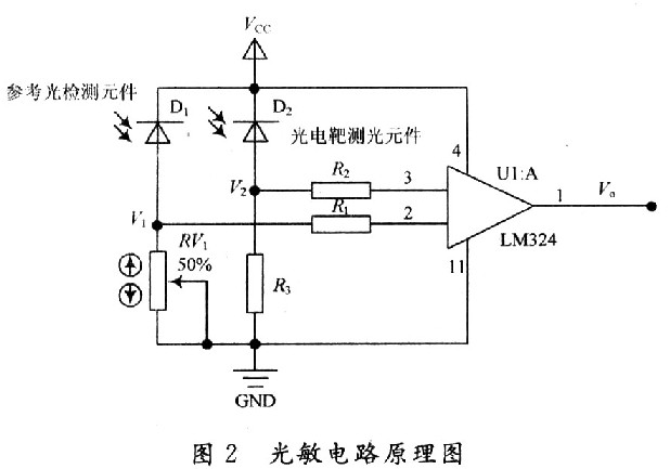 以前有的方案是利用光纤将采集的激光信号传导到光敏元件,这里为了降低成本减少体积,将光敏管直接布置在靶面上,每个光敏元件由一个遮光管套住,可避免大部分散射光的影响。光敏电路是光电靶的核心,也是本设计的创新之处,其他电路围绕光敏电路展开设计。利用比较器进行光电检测的模数转换,图2是光敏电路的基本原理图。其中LM324是运算放大器,作为比较器使用,当电压V2>V1时,运算放大器正向饱和,输出电压V。接近电源电压,称为高电平1;当电压V2<V1时,运算放大器反向饱和,由于这里只使用了单电源供电,运放输出V0=O V,称为低电平0。