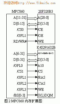 在系统的语音处理过程中需要一定的存储空间,由TMS320C5402数字信号处理器只有16k的片上存储空间无法满足语音处理过程的要求,因此需要进行存储器的扩展。TMS320C5402带有内存扩充,MPC860的内存控制器就附带有8个内存槽。因此在本系统中,对于存储器的扩展,可以在TMS320C5402进行,也可以在MPC860进行。在本系统中为保持MPC860对整个系统的更好的控制和功能紧凑,这里在MPC860上进行扩展。经过分析比较,决定使用1片4MBFlash E2PROM和2片16MBSDRAM。其中,Flash E2PROM采用Intel公司的28F320B3,占用BANKO,对应于/CS0片选信号,内存管理机制选择GPCM(通用片机选择机制),数据总线宽度为32位,SDRAM采用SAMSUNG公司的K45281632B。占用BANKI,对应于/CS1片选信号,内存管理机制选择UPMA(用户可编程机制),2片SDRAM并行使用,数据总线宽度为32—bit。如图2 所示。