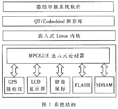 船舶导航系统目前主要有PC机系统、单片机系统和嵌入式系统等三种实现方式。常见的PC机船舶导航系统采用基于Windows的GIS软件(如MapInfo、MapGIS)设计,具有系统功能丰富、响应速度快、人机交互界面友好等特点,但成本较高、系统集成度差,不适合用为专业系统使用。单片机电子海图应用系统由于处理器运算能力较弱,资源有限,支持网络化困难,而且在图形用户界面实现较为困难,近年来已较少使用。随着嵌入式系统的发展,电子海图应用系统有了更好的选择,使用嵌入式32位处理器和嵌入式操作系统的产品逐渐出现。由于系统集成度高、硬件成本较低等特点,在近几年获得较多应用。而采用WindowsCE、Vxworks、Palm OS等商用嵌入式操作系统,存在软件开发成本较高的缺点。