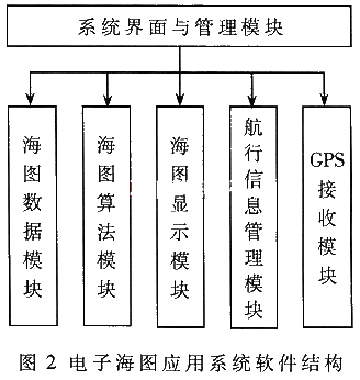 系统软件如图2所示,主要由以下模块组成:系统界面与管理模块、海图数据模块、海图算法模块、海图显示模块、航行信息管理模块、GPS接收模块等。