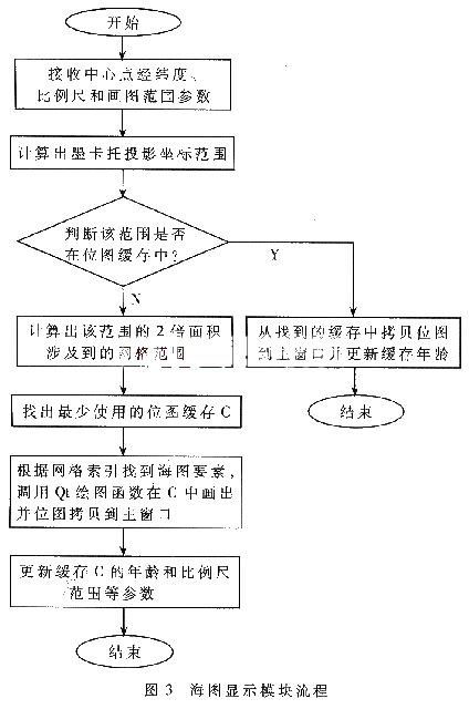 海图显示模块:海图显示是系统的核心模块。该模块根据管理模块给出的中心点位置及显示范围的参数,确定需要绘图的网格,根据网格索引,快速完成绘制海图的功能。考虑到海图漫游通常是连续的,使用了位图缓存来提高响应速度,每次画图的时候,先在缓存中找,找不到则扩大范围画图,并保存到位图缓存,对缓存的管理采用最近最少使用替换算法(LRU)。具体流程如图3所示。