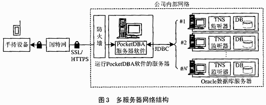 当用户同时运行多个数据库服务器时,可以采用图3配置。PSS软件安装在装有WindowsNT、Windows 2000、Solaris、Red Hat Linux的机器上。对于图3最右边的数据库服务器,只要支持Oracle数据库,服务器操作系统类型没有限制。图3中掌上电脑用HTTPS协议通过Internet将通信请求送到防火墙。身份验证通过后,防火墙允许请求并送到PSS。PSS通过JDBC接口与适当主机上的TNS监听器联第,TNS监听器与数据库通信。