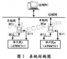 系统构成如图1所示,远端PC通过局域网和本地PC通信,在通信中使用Winsock控件和TCP/1P协议;本地端PC通过并行通信接口或串行通信接口与单片机通信,在并口通信中使用WINIO并口通信驱动程序、EPP协议和LPT打印机接口,在串口通信中使用MsComm控件、RS 232C协议和COM口。在此结构中,本地PC端起到中继的作用,当本地端PC接收到从远端PC传送过来的命令,在选择通信方式后,与单片机通信,使单片机向远端PC传送数据。