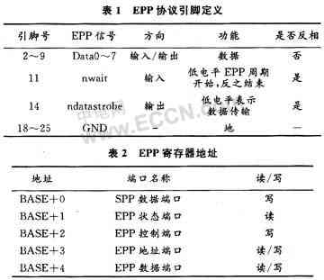 (2) EPP协议的寄存器地址及一些主要的引脚定义,如表1,表2所示。