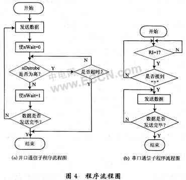 单片机部分可进行并口和串口2种方式的通信,用汇编语言编写通信子程序。在这里分别给出2种方式的程序流程图。如图4(a),(b)所示。