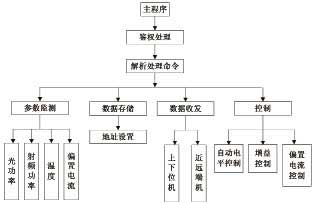软件总体功能主要分为四个部分:参数监测、数据存储、数据收发和性能控制。在主程序中采用两个中断:定时器中断和串口中断。定时器中断实时采集参数数据,实现模块的实时监测;串口中断实时收发上位机和FSK数据,实现命令的处理和监控数据的传输。