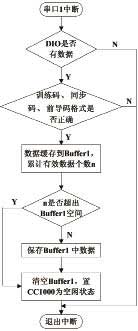 在通信过程中,CC1000具有三种状态:IDLE(空闲)、RX(接收数据)、TX(发送数据)。由于CC1000与单片机之间是半双工模式通信,因而RX与TX两个状态会互斥。数据的接收由串口中断完成:UART0接收中断接收来自上位机的数据,UART1接收中断则接收来自CC1000的数据。UART1中断服务程序数据传输流程如图6所示。在接收过程中,为了避免数据帧长度过长的问题,当接收的有效数据超过缓冲区空间时,单片机判定此帧无效。