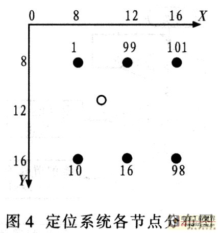 实验区域描述:本实验在教学楼五楼实验室进行:长×宽=8.13m×8.10m,在本次实验中使用6个参考节点和1个定位节点,各参考节点坐标设置如图4所示。参考节点旁边的数字为节点编号,6个参考节点(黑色的为参考节点)坐标依次为(单位为m):1(8.00,8.00),99(12.00,8.00),101(16.00,8.00),10(8.00,16.00),16(12.00,16.00),98(16.00,16.00)。