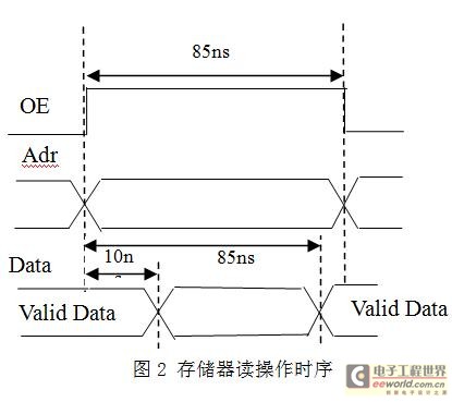 根据系统需要,设计中采用GPIF接口模式将CY7C68013设为FIFO READ和SINGLE READ两种模式, 让GPIF中的端点FIFO与USB通信中端点缓冲直接建立连接, 数据的传送不再需要CPU 的参与。 根据外部测试电路的要求,适用于不同测试环境预设电路的CPLD编程信号,根据实际的测试信号的频率采用不同的采样频率,设定不同的触发电平,使用单次写模式可以完成编程数据的输出。针对的测试数据采用FIFO多次读模式,实现数据的批量传输。设计中采用48M晶振,由于静态存储器的在使能信号(OE)的上升沿后推地址(Adr),而数据在总线上的保持时间至少需要85ns,因此在波形设计中数据有效时间应该为4个时钟周期,才能够满足地址有效的要求。静态存储器读操作时序图如图2所示。