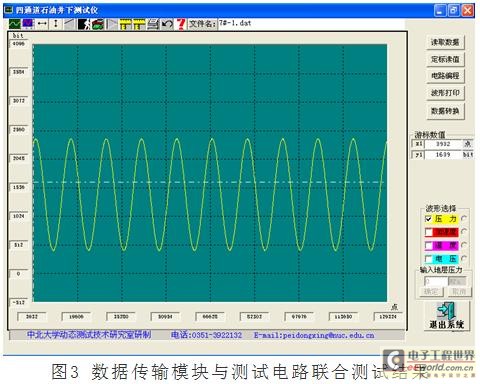 在系统测试中,利用信号发生器产生输入信号为正弦波,频率10Hz,测试系统的采样频率125Ksps,通过系统电路采样,存储,数据通过传输模块传入计算机,根据采集数据恢复的信号与原始信号比较,失真较小,噪声水平低,采集数据的有效位数达到12位,实验结果表明,实际的传输速率120Mbps,满足了测试系统的数据传输要求。与实验测试系统联合调试,实际采样波形如图3所示。