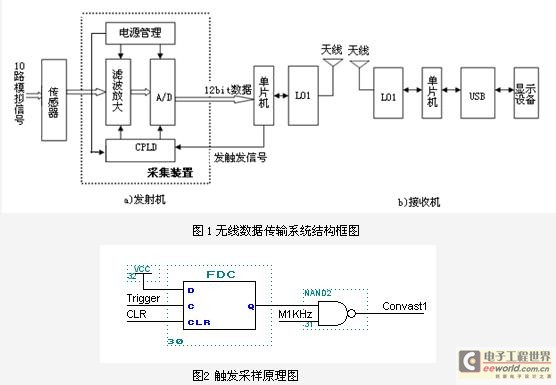 图1为系统设计总体框图。此无线数据传输系统主控制芯片采用Microchip公司的PIC16F877微处理器,它负责控制无线芯片L01,实现数据的无线传输。为了进行多通道的数据采集,这里采用10片A/D进行分时采样,它们的工作时序则由CPLD来控制,每路采集的数据经单片机处理后无线发射,至于何时采样,则由单片机发的Trigger信号决定。 在与计算机的通讯方面,系统采用USB芯片通过USB口将无线接收数据送入计算机,并存储在一个二进制文件内,当传输完毕后,运行VB读数软件,可将采集的信号读出以供分析。