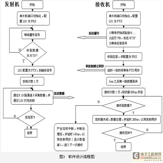 基于以上分析,该系统软件分为两部分:单片机控制程序和计算机界面程序。前者主要完成以nRF24L01为核心的多通道信号的采集和无线传输,后者则完成信号的显示,以供研究人员分析。本文只介绍控制程序,它采用模块化程序设计方法, 分为发射机程序和接收机程序两部分。其流程图如图3所示。