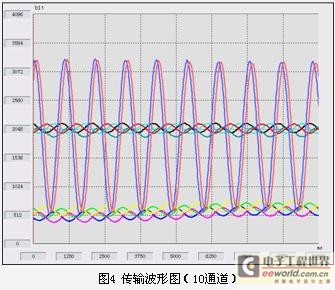 本系统需进行10000次数据传输,每次传输20字节。传输数据时务必保证发射机和接收机的同步性,否则数据包之间将会出现错位,得到的数据曲线会严重失真,影响分析,所以同步问题在无线数据传输系统占重要地位。现附上本系统在同步良好情况下的无线数据传输波形图,见图4。图中的10条曲线是传感器信号被10片A/D采样后经无线传输至计算机后通过VB界面显示出的,中间幅值较高的曲线是两路正弦波,其余为基线。