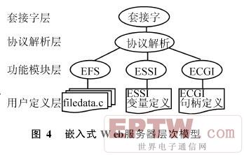 如图4所示,嵌入式Web服务器包含四个层次,分别为套接字层、协议解析层、功能模块层和用户定义层。套接字层负责本系统与网络上的数据收发;协议解析层负责解析HTTP协议,从中获取有效数据或按照HTTP协议要求,生成HTTP协议报文;功能模块层有三个部分,分别是嵌入式文件系统(EFS)、嵌入式服务器端包含(ESSI)、嵌入式通用网关接口(ECGI);用户定义层的三个部分由用户(开发人员)自定义,从而在不改变其他模块的情况下,增加、减少或修改系统的功能,使得系统具有二次开发功能。