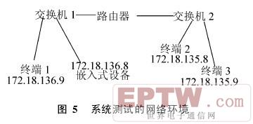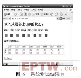 为了验证方案的可行性和实用性,在上述的软硬件平台的基础上,搭建了一个测试环境:在ARM处理器上外接八个LED指示灯,通过嵌入式Web服务器显示并控制每一个LED指示灯的亮和灭。系统测试的网络环境如图5所示,该网络由两个网段组成,用一台路由器连接,网段一的地址为172. 18. 136. 0/24,段内连接终端1和嵌入式设备,网段二的地址为172.18. 135. 0/24,段内连接终端2和终端3,具体的地址分配如图5所示。嵌入式Web服务器运行在IP地址为172. 18. 136. 8的嵌入式设备上,测试结果如图6。结果表明,无论是在同一网段内的终端1上访问嵌入式Web服务器,还是在不同网段的终端2和终端3上访问嵌入式We服务器,系统都可以正常、稳定地运行,并实现对嵌入式设备的监控功能。