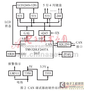 在实现上,CAN监控终端的主控芯片选用TI公司的TMS320LF2407A型DSP。该DSP除了具备片内资源丰富、运算速度快、成本低、功耗小等特点外,还具备片上CAN模块,使用方便。数据输出用1块240×128的LCD液晶屏来实现,可以把各个参数变化的趋势用曲线描绘出来,灵活性好。用户输入采用行列扫描式键盘,使硬件实现和软件编程均比较方便。