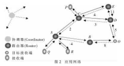 要实现系统功能,网络建模需有严格的功能分配:首先要有协调器,它必须是FFD(全功能设备),同时也是整个网络的灵魂,它记录着每个设备(Device)的地址;其次,需有路由设备,它也必须是FFD,用于接收与转发信息;最后,需有接收端,它可以采用FFD,也可以采用RFD(精简功能设备)。如果是RFD,则此设备只能充当接收终端,而不再能转发数据。基于此而建立的应用网络如图2所示。下面简要介绍其实现机理。