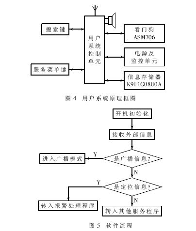 用户系统原理如图4所示,它主要由用户系统控制单元及其附属单元组成。用户系统控制单元选用由ATmega128L+CCS2420组成的ZigBee套件和ATMEl的MP3管理芯片构成;看门狗ASM706防止用户系统死机,电源及监控单元保证系统处于安全供电模式,从而防止因系统电压较低而造成的无法正常工作的现象。信息存储器选用128MB的三星闪存K9F1G08U0A,它负责提供景点信息和其他服务信息。当用户在大的地方发现迷失方向时,只需一按搜索键,系统就进入报警模式。服务菜单键还可为用户提供其他服务信息,如附近便利店、搜求电话等信息。当用户进入景点时,该系统自动进行播放,在接收到其他外部信息或进行手动操作时才退出操作。
