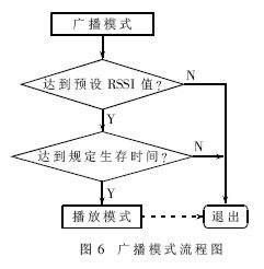 广播模式需要根据RSSI算法进行评估,从链路质量信息判断是否达到播放条件。如果是,就通过MP3芯片启动语音播放程序;如果接收到中断消息就退出语音播放程序,根据中断消息进行处理,返回时默认到接收外部信息模式。