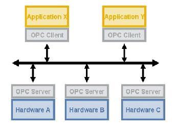 针对特定设备的OPC服务器一旦编写完成,它就能被重用于仸何作为OPC客户端的应用。OPC服务器使用Microsoft的OLE技术(也被称为组件对象模型,或COM)来与客户端通信。