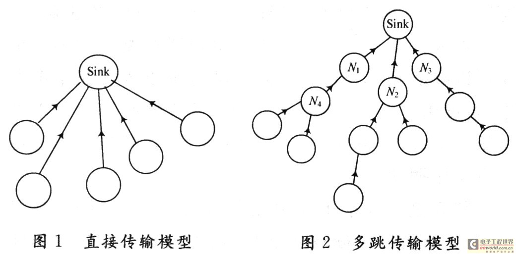 直接传输模型是指传感器节点将采集到的数据通过较大的功率直接一跳传输到Sink节点上,进行集中式处理,如图1所示。这种方法的缺点在于:距离Sink节点较远的传感器节点需要很大的发送功率才可以达到与sink节点通信的目的,而传感器节点的通信距离有限,因此距离Sink较远的节点往往无法与Sink节点进行可靠的通信,这是不能被接受的。且在较大通信距离上的节点需耗费很大的能量才能完成与Sink节点的通信,容易造成有关节点的能量很快耗尽,这样的传感器网络在实际中难以得到应用。
