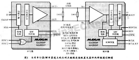 MAX9205和MAX9206是美信公司推出的一组差分信号芯片组。其中MAX9205可将1O位并行COM数据或TTL数据转换成具有内嵌时钟的高速串行数据流;MAX9206则是可接收该串行数据流并将它们转换为并行数据的解串器。同时又可以重建并行时钟。该器件组进行数据转换采用的是内嵌时钟,这样就可有效的解决由于时钟与数据的不严格同步而制约高速传输的瓶颈问题。MAX9205/MAX9206的内部结构及应用方法如图1所示。
