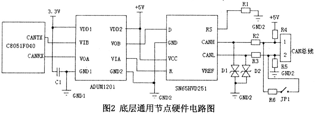 ADuMl20l是ADI公司生产的隔离器,采用平面磁场专利隔离技术,取消了光电耦合器中的光电转换过程。因此ADuMl201具有优于光电隔离器的优点:速度更高(最高速率达到25 Mbps)、功耗更低(最小工作电流为0.8mA)、性能更高、体积更小、价格更便宜、应用更灵活(多通道数字隔离器能在同一芯片内提供发送和接收通道)。选择ADuMl201用来实现CAN控制器和CAN驱动器之问的电气隔离,增强系统的稳定性,提高了系统的抗干扰能力。