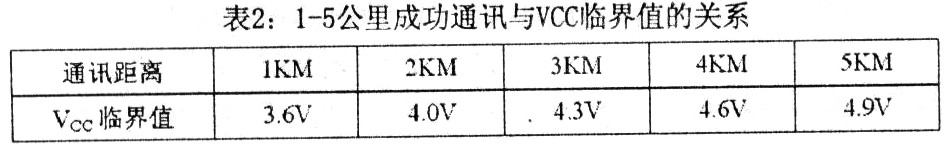 在实验的过程中,观察到SN65HVD251工作电压VCC端的大小对于传输距离的影响很大,经过大量的实验,得出1-5公里距离成功通讯的VCC临界电压值(精确到O.1V),所谓临界电压值是在确定距离内能正常传送数据的最小值。如表2所示。