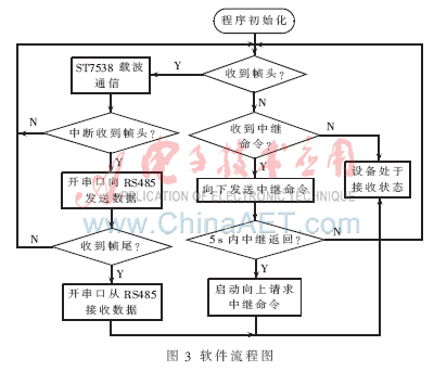 通信模块平时工作在载波接收状态,接收到一帧数据后解调给TTU数据采集端,TTU采集端接收并返回数据,数据调制后经电力线传给主站经解调后给采集终端。在规定的时间内RS485接收到数据时进行载波发送,数据发送结束后返回接收状态。若在规定的时间内RS485没有接收到数据也自动返回载波接收状态。通信模块的软件流程如图3所示。