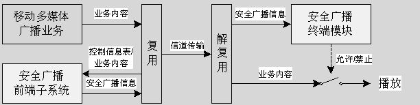 安全广播终端模块在终端接收移动多媒体广播业务内容时,根据业务标识号从传输帧中解复用获得安全广播信息,并对安全广播信息进行校验,根据校验结果确认广播业务内容的合法性,进而允许或禁止业务展现。