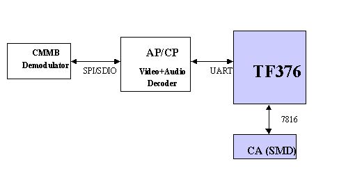 上图是TF376在CMMB终端的硬件连接图,TF376通过UART接口与终端的AP(应用处理器)或者CP(协处理器)连接,Nagra的SMD CA芯片通过7816接口与TF376连接。CMMB终端系统工作时,AP或者CP将接收到的CMMB码流进行解复用得到复用帧,并将复用帧传送给TF376软件模块,TF376软件模块对相应的复用帧进行CA解扰及安全广播信息处理,播放器可从TF376软件模块得到解扰后的清流数据并进行解码。