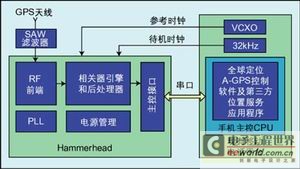图:Hammerhead PMB2520应用于普通手机中的电路框图。此A-GPS芯片通过串行接口与基带部分通讯,并使用手机现有的时钟时序发生机制。