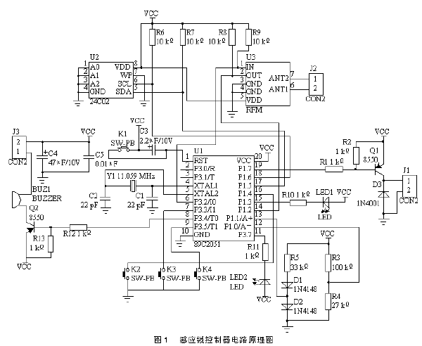 钥匙存储器选用ATMEL公司的24C02 ,可存储30个钥匙。如果打算存储更多的钥匙,应选用该系 列更大容量的型号。为获得更高的可靠性可采用美国XCOR公司的兼容型号。