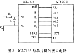 ICL7135是高精度四位半CMOS双积分型A/D转换器,具有如下特点:(1)转换速度为3~10次/s,分辨率相当于14位二进制数,转换误差为±1 LSB,转换精度高。(2)量程范围0~1.999 9 V。(3)对输人的模拟信号过(欠)量程能够识别;具有自动转换和自动调零功能,可保证零点在常温下的长期稳定性。(4)与单片机可直接连接,不需地址选择信号。当ICL7135工作于双极性情况时,时钟最高频率为125 kHz,可采用555定时器作为ICL7135的CLK时钟输入。当ICL7135的积分器在积分过程中(对信号积分和反向积分),其BUSY端输出高电平,积分器反向积分过零后输出低电平。ICL7135的POL端为极性输出端。当输入信号为正时POL输出高电平;当输入信号为负时POL输出为低电平。B1、B2、B4、B8是BCD码输出端。A/D转换器的基准电压的精度和稳定性是影响转换精度的主要因素。为保证ICL7135的转换精度,我们采用高准确度、低温漂的带隙基准电压源MC1403向其提供1 V的基准电压。A/D转换器与单片机的基本连线见图2。