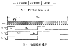 发射电路部分由PT2262编码器和F05发射模块组成。其中PT2262是一种CMOS工艺制造的低功耗低价位通用编码电路,能将数据和地址编译成代码的波形。它最大有12位(A0~A11)三态地址端管脚(悬空,接高电平,接低电平),共有531441种地址代码。最大有6位(D0~D5)数据端管脚,设定的地址码和数据码从17脚串行输出。信号格式如图3所示,编码时序如图4所示。