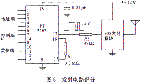 F05具有较宽的工作电压范围及低功耗特性,当发射电压为3 V时,发射电流约2 mA,发射功率较小,12 V为最佳工作电压,具有较好的发射效果,发射电流约5~8 mA,大于12 V直流功耗增大,有效发射功率不再明显提高。F05系列采用AM方式调制以降低功耗,数据信号停止,发射电流降为零。数据电平应接近F05的实际工作电压以获得较高的调制效果,F05对过宽的调制信号易引起调制效率下降,收发距离变近。当高电平脉冲宽度在0.08~1 ms时发射效果较好,大于1 ms后效率开始下降;当低电平区大于10 ms,接收到的数据第一位极易被干扰(即零电平干扰)而引起不解码。如采用CPU编译码可在数据识别位前加一些乱码以抑制零电平干扰,若是通用编解码器,可调整振荡电阻使每组码中间的低电平区小于10 ms。平时F05输入端应处于低电平状态,输入的数据信号应是正逻辑电平,幅度最高不应超过F05的工作电压。F05应垂直安装在印刷电路板边部,应离开周围器件5 mm以上,以免受分布参数影响而停振。发射部分电路见图5。
