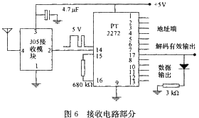 接收电路部分主要由PT2272解码器和J05接收模块组成。其中PT2272最多可有12位(A0~A11)三态地址端管脚,任意组合可提供531441地址码,最多可有6位(D0~D5)数据端输出管脚,17脚为解码有效指示输出,PT2272分为锁存型输出或非锁存型输出。