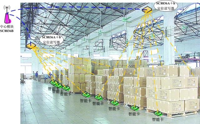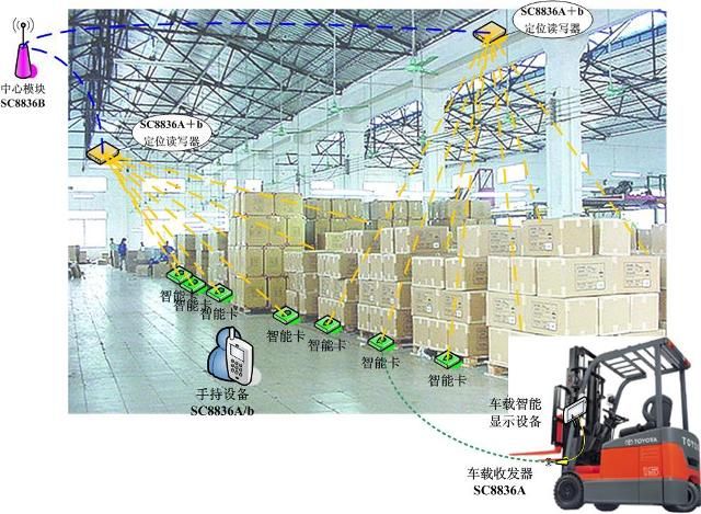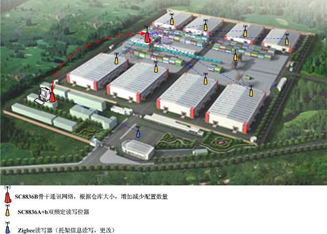 2、每个仓库内部采用双频定位收发模块SC8836A+b,时时采集仓库内部库存信息,配合仓库信息管理软件系统,进行货物定位仓位分配管理。并可通过定位收发模块对托盘上配置信息卡进行发射功率,休眠间隔,卡号信息,声光提示等工作模式进行设置修改。