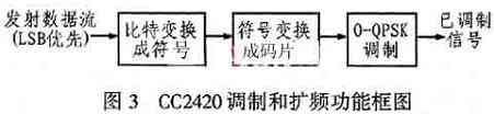 IEEE802.15.4 规范中规定使用DSSS调制方式,CC2420 中的调制和扩频功能框图如图3所示。