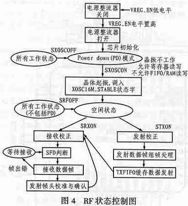 CC2420为 IEEE802.15.4 的数据帧格式提供硬件支持。其MAC层的帧格式为:头帧+数据帧+校验帧;PHY层的帧格式为,同步帧+PHY头帧+MAC帧,帧头序列的长度可以通过寄存器的设置来改变。可以采用16 位CRC校验来提高数据传输的可靠性。发送或接收的数据帧被送入RAM中的128字节的缓存区进行相应的帧打包和拆包操作 其RF的状态控制图如图4所示。