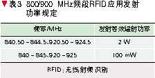 信息产业部于2007年4月23日发布了信部无[2007]205号文件《关于发布800/900 MHz频段射频识别(RFID)技术应用试行规定的通知》,规定800/900 MHz频段RFID技术的具体使用频率为840~845 MHz和920~925 MHz。表3给出了发射功率的规定。